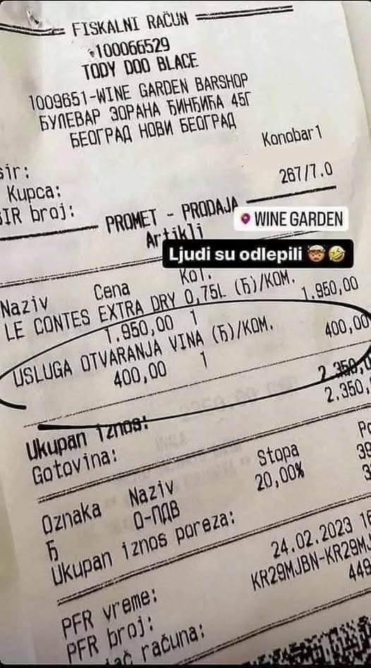 Ovo je priča iz sela Stopanje ,a o Beogradu i da ne pričamo . U jednom restoranu naplaćuju i otvaranje vina . Za taj čin platićete „sitnih“ 400 dinara .
