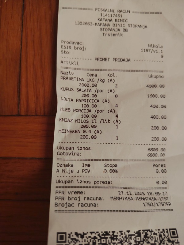 Na prvi pogled cena kilograma prasetine u običnim birtijama nije visoka . Prasetina 2.000 dinara ali ako se gost prevari da uzme i salatu , pogotovo onu od sirovog kupusa , onda je cena nestvarna . Za 8 salata gost je morao da plati čitavih 1.600 dinara . Po tržišnim cenama gost je mogao da kupi 32 kilograma kupusa i da stavi zimnicu za te pare . Hleb je 400 dinara . Četiri ljute papričice još 400 dinara . Stari kafanski štos . „Navuče“ gosta na jeftinu hranu , a „odere“ ga na salatu i piće .
